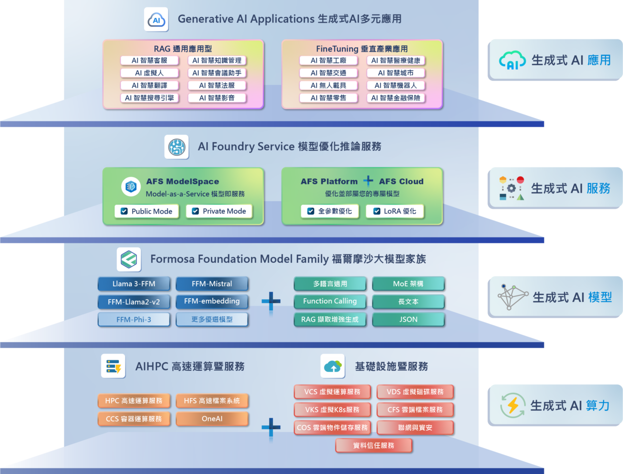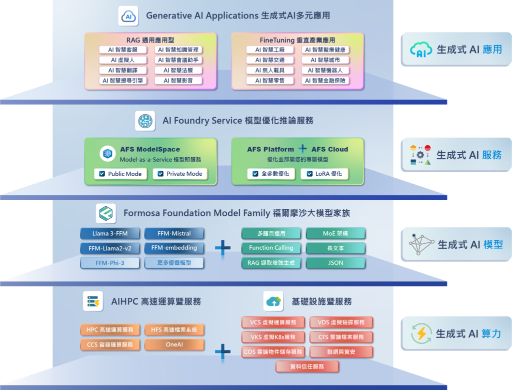 AFS ModelSpace,提供同等於 ChatGPT 的 API,整合本圖上層的各種 AI 軟體應用,與新創一同打造未來企業的 AI 應用。