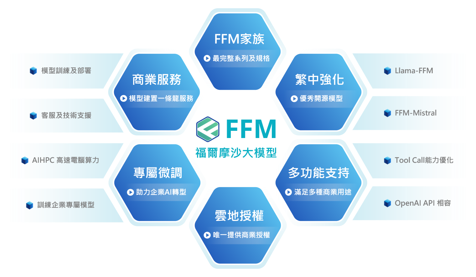 台智雲領台灣之先,最早發表繁體中文大語言模型 —「福爾摩沙大模型」(Formosa Foundation Model)。FFM 模型系列自 BLOOM、Llama2、Mistral 到最新的 Llama3.1,提供各式開源模型之繁中強化版本。在快速變化的 LLM 應用需求中,及時提供您最完整多樣的大語言模型規格及應用服務,加速企業 AI 2.0 落地應用。